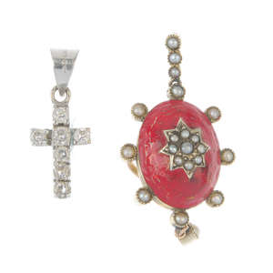 To include a late 19th century 9ct gold enamel and split pearl pendant, a paste cross pendant, two single earrings, together with a fob. Fob AF. Length of enamel pendant 3.3cms. Total weight 9.9gms.