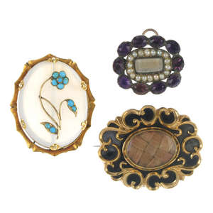To include a brooch, the white chalcedony with applied flower design set with turquoise to the flower and leaves, together with an oval brooch with applied 'Mother'. Lengths 2.2 to 3.9cms. Weight 43.9gms.