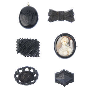 To include a jet and shell cameo brooch, seven jet brooches of various design, a jet horseshoe item and a further four items. Some AF. Lengths of brooches 6.7 to 2.8cms. Lengths of other items 4.7 and 1.3cms.