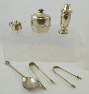 A SELECTION OF SILVER ITEMS to include; a silver tea caddy, sugar caster, mustard and pair of Georgian tongs, mixed assays, a plated spoon and a pair of tongs, weighable silver 245g