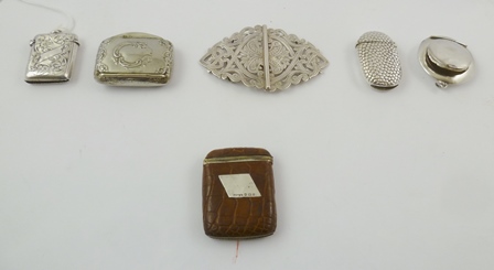 A SELECTION OF SILVER VESTAS AND OTHER ITEMS comprising; a leather clad vesta and two others spot finished and bright cut, a nurses buckle, a circular squat pill case and another plated of cushion shape