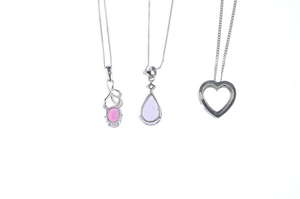 A selection of three 9ct gold gem-set pendants. To include a pink tourmaline floral pendant, together with two further pendants, each suspended from a chain. Pendant and one chain with hallmarks for 9ct gold. Length of pendants 1.5 to 2.4cms. Length