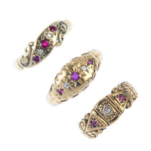 A selection of three 9ct gold gem-set rings. To include a ruby and diamond point scrolling ring, a ruby and single-cut diamond five-stone ring, together with a single-cut diamond and synthetic ruby scrolling ring. Hallmarks for 9ct gold. Weight 7.8gm