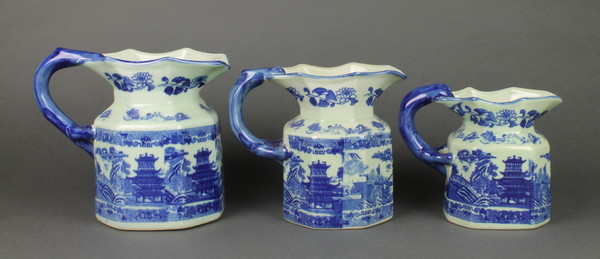 A set of 3 19th Century style graduated blue and white pottery jugs