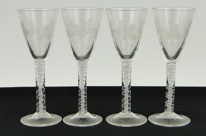 A set of 4 engraved glass goblets, with multi-twist milk glass stems, 7.5''.