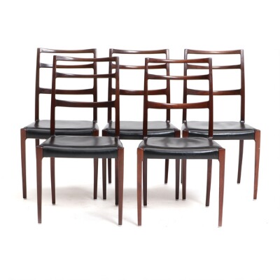 A set of five high-backed mahogany dining chairs upholstered with black leather.