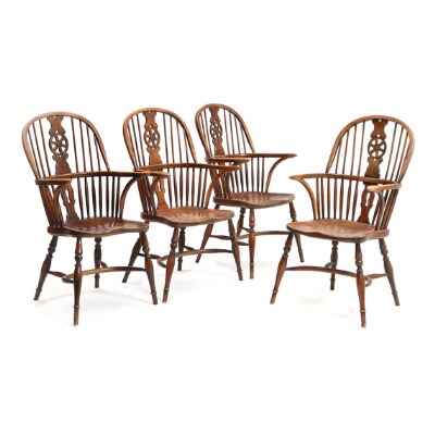 A set of four 20th century elmwood wheel-back windsor armchairs
