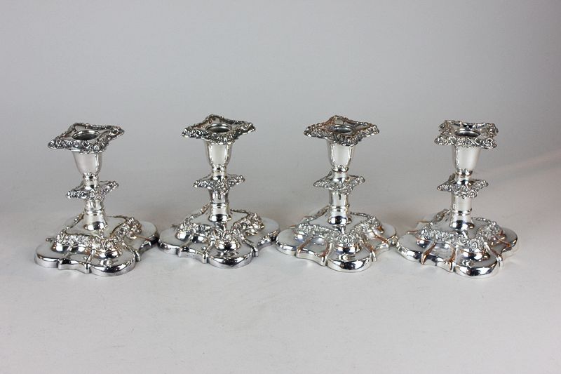 A set of four silver plated dwarf candlesticks with embossed floral scroll borders on scalloped bases 13cm (one a/f)