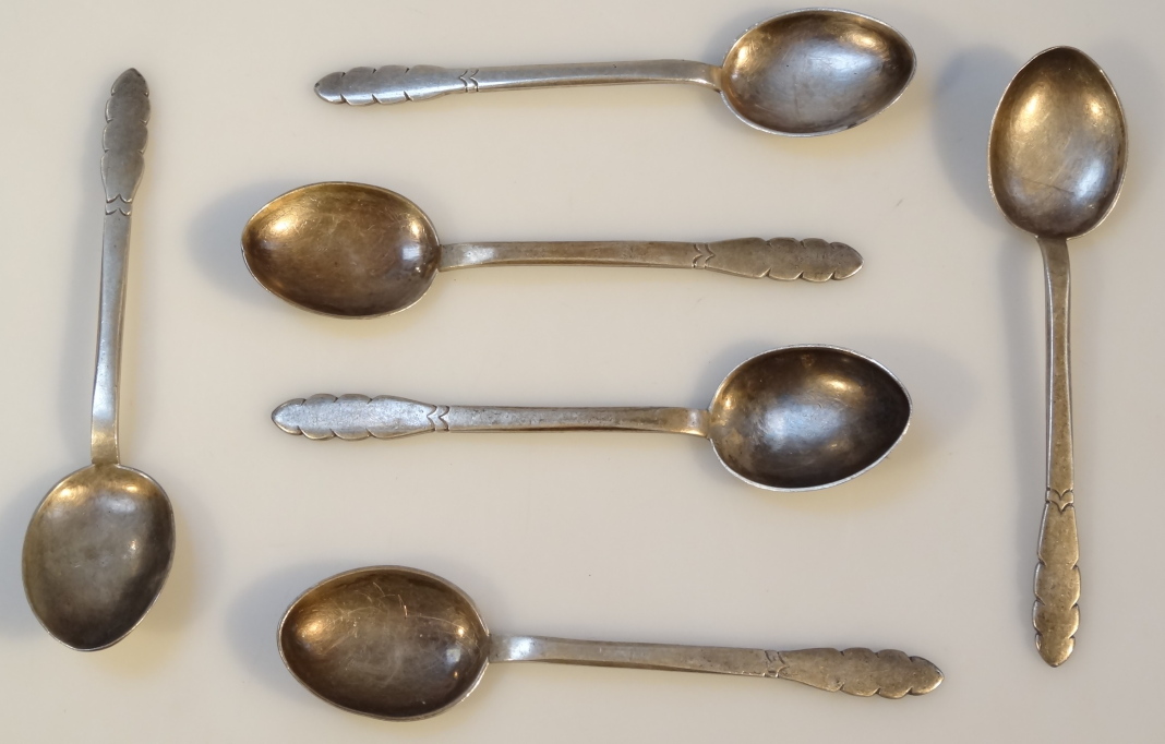 with shaped handles and plain bowls, Birmingham 1950, 11cm high, 3oz. (6)