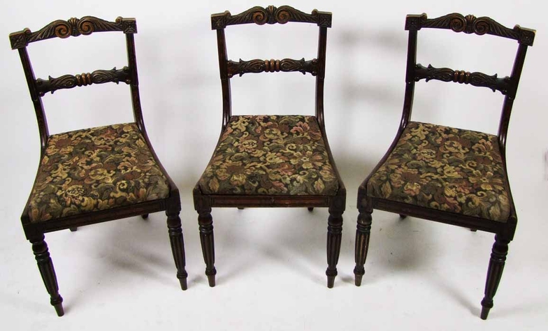 A set of six Regency simulated rosewood dining chairs, with scrolled tops and mid-rails, Trafalgar seats, on gadrooned legs