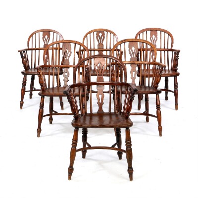 A set of six yew and ash Windsor chairs