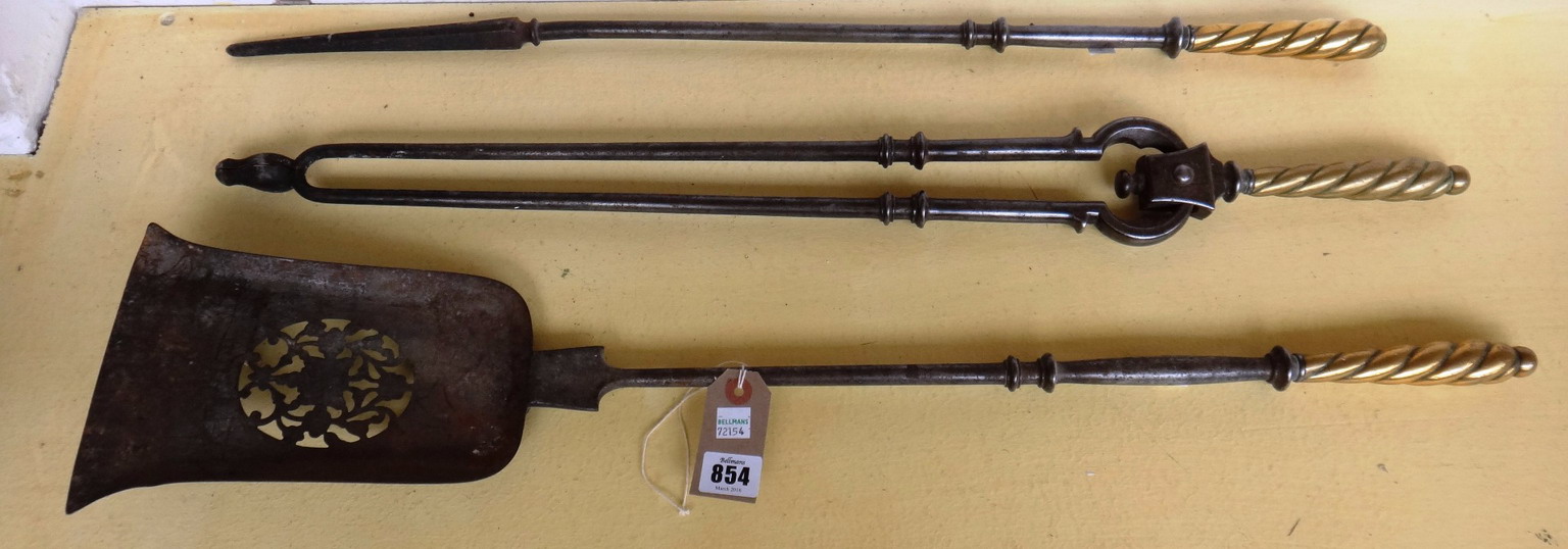 A set of three English steel and brass mounted fire irons