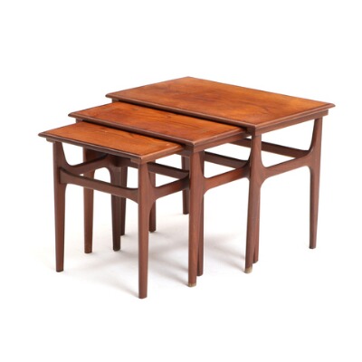 A set of three teak nesting tables with side turned apron