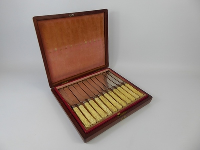 A Set of Twelve Carved Bone-Handled Knives and Forks, in original mahogany box