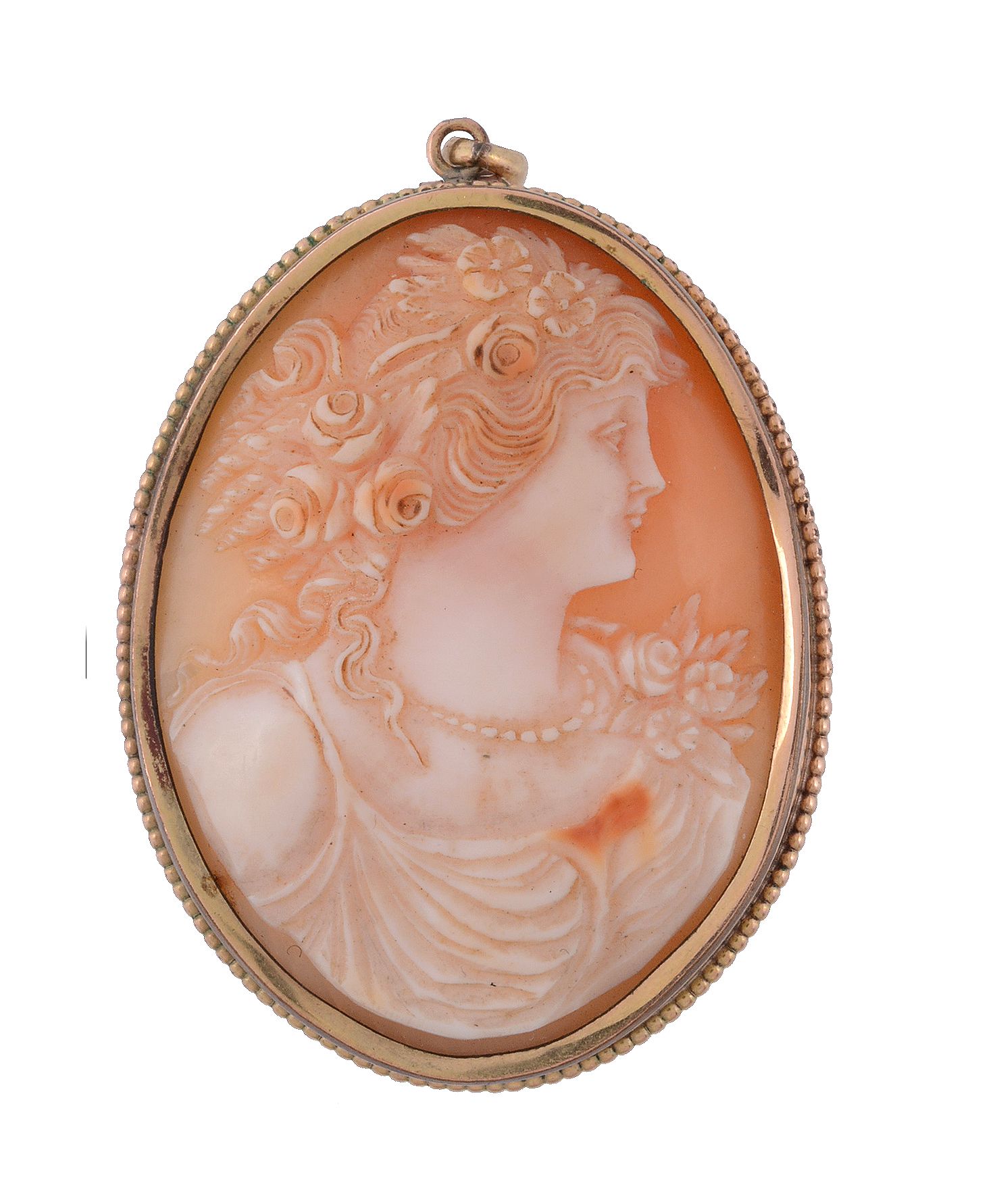 circa 1900, the oval shell carved with the profile of Flora, with flowers in her hair, 5.3cm long