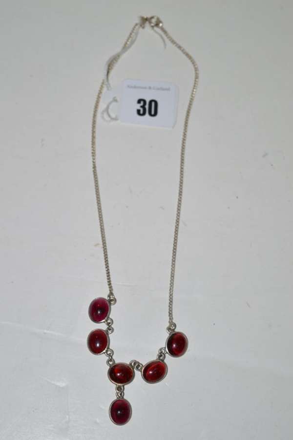 A silver and garnet necklace, set with six garnet cabochons on silver trace link chain.