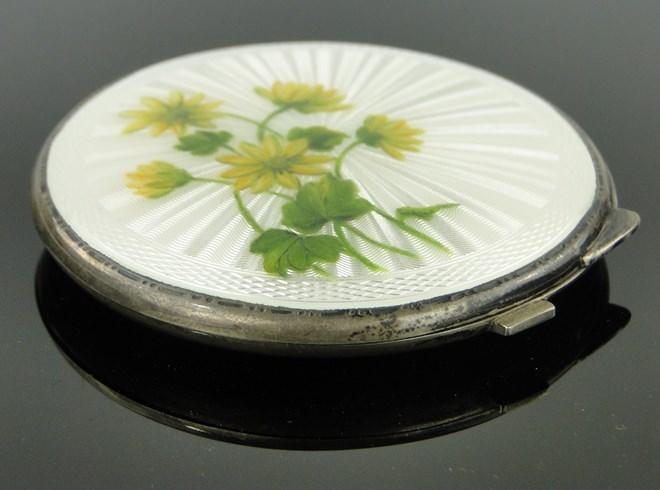A silver and white enamel compact, with painted floral spray Birmingham 1949, 7cm across.