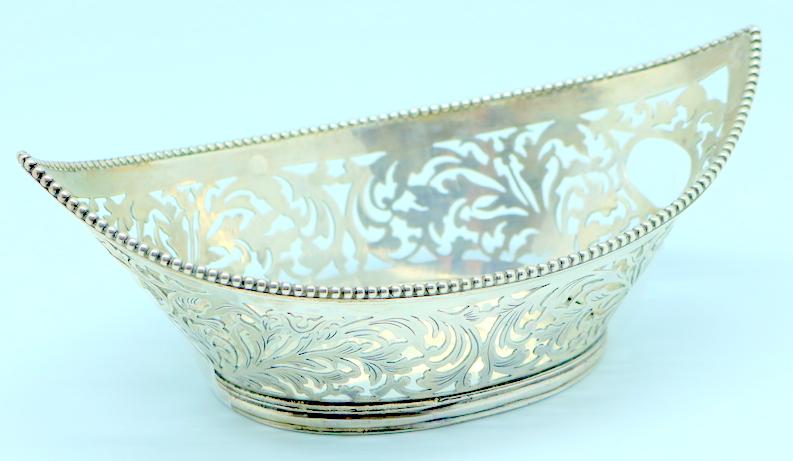 A boat-shaped model with pearl edge over openwork decoration of tendrils. With integrated oval open handles. Mt. J. Increases, Hoorn. Jl. 1916. (loose soil) Dim. ca. 16 x 9 cm. Hover to zoom