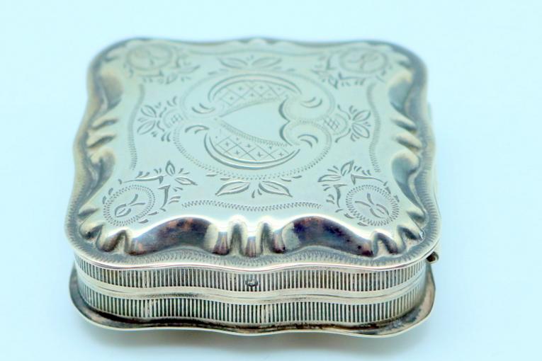 An oval model with boat-shaped lid with ring and engraved with delicate floral decor. Mt. Peter Cool, Sneek. Jl. 1815. Z.835. Hover to zoom