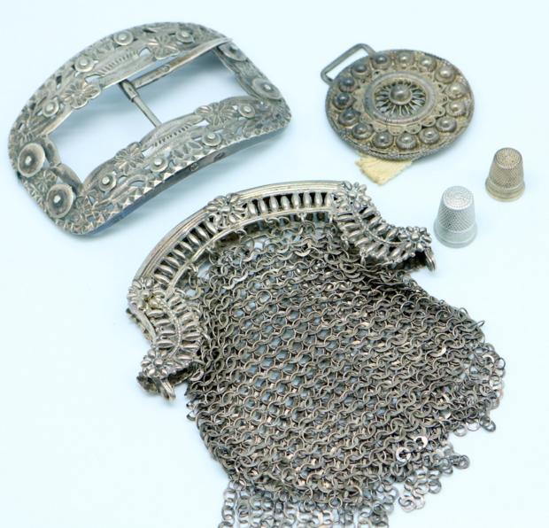 Rectangular with floral decoration, balls and baskets. Mt. P. Hoogendoorn Jr. Willige Langerak, from 1882 to 1901. Z. 835, this half a buckle and a malienbeursje and two thimbles. Hover to zoom