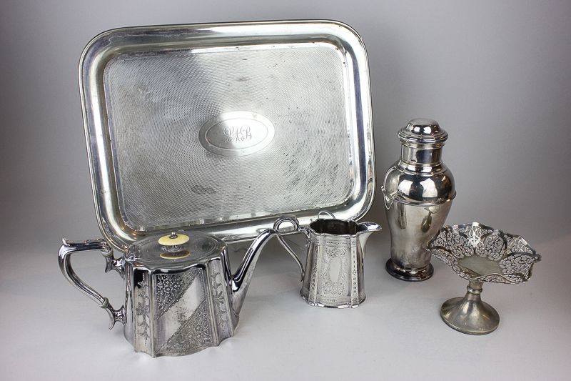 A silver plated cocktail shaker, a Victorian silver plated teapot