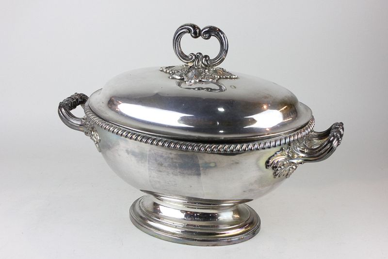 A silver plated oval two-handled pedestal tureen and cover with double scroll handle and gadroon border, 37cm