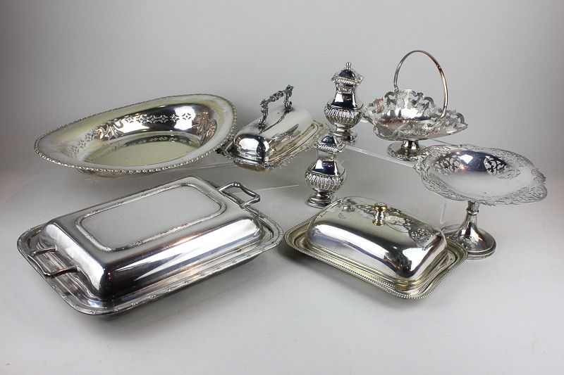 an embossed butter dish with cover and clear glass liner, an oval cake basket, two pedestal dish, a salt and pepper and a covered dish with liner