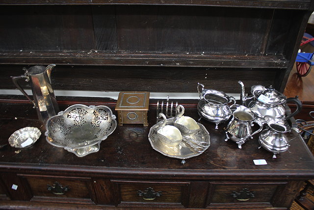A SILVER PLATED THREE PIECE TEA SET together with a further small quantity of silver plate to include a pair of sugar basins in the form of swans, silver plates salver etc