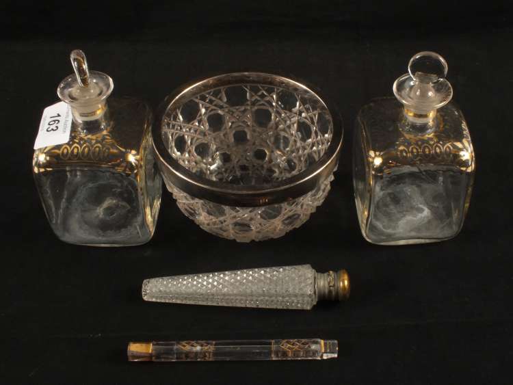 A Silver rim cut glass bowl, a pair of Victorian gilt and glass toilet jars and other items