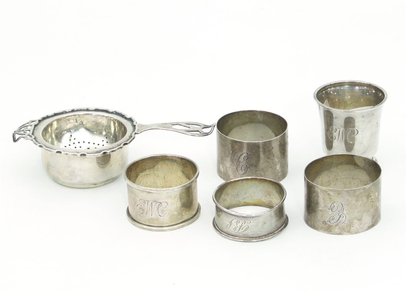 Birmingham 1939, four napkin rings and a small beaker, approximately 175gm