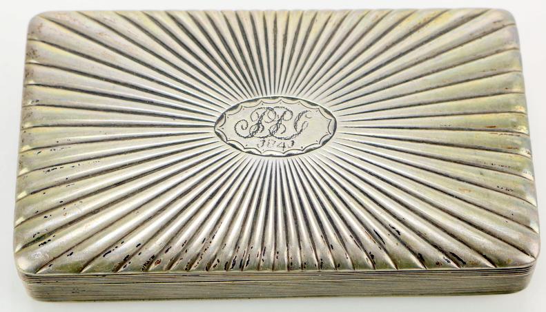 Rectangular, ribbed bottom and lid with lobed radiation pattern and monogram PPG 1843. Mt. A. Kooiman, Schoonhoven. Jl. 1828. Z. 835. Hover to zoom