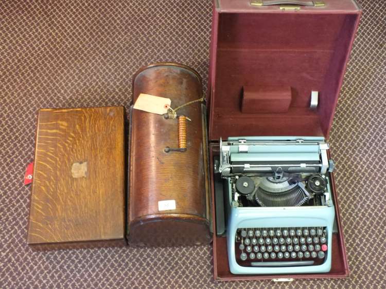 A Singer sewing machine, Brass coal helmet, portable typewriter etc