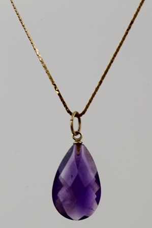 A SINGLE STONE AMETHYST ON CHAIN, having a pear cut stone on fancy gold coloured metal S-link chain