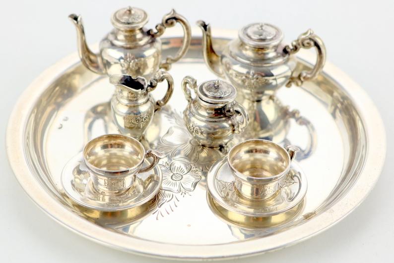 A teapot, coffee pot, milk jug, sugar bowl and two cups and saucers. Round tray, engraved with floral decor. Spain. Hover to zoom