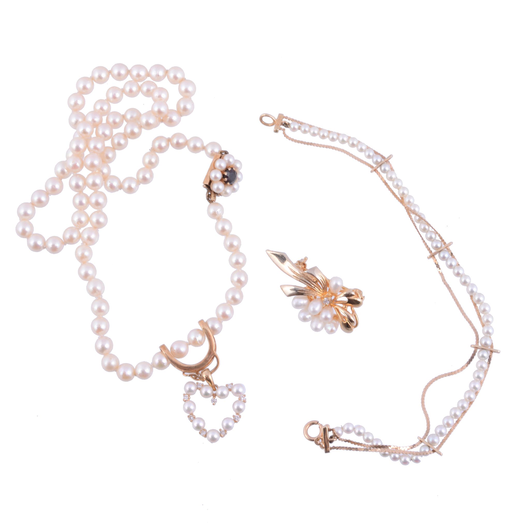to include a diamond and cultured pearl heart shaped pearl slide, 3.5cm long; a uniform cultured pearl necklace, to a garnet and cultured pearl 9 carat gold clasp, 46cm long; a cultured pearl bracelet, the clasp stamped 14k; and a freshwater pearl co