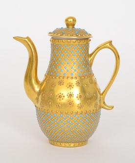 A small contemporary coffee pot decorated by former Royal Worcester gilder Ken Russell, the gilt ground with blue enamel jewelling, after the Dudley service, signed, height 9.5cm