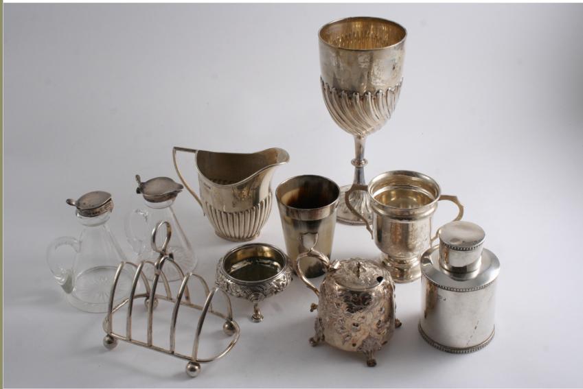 a small mounted horn beaker, two mounted glass whisky tots, a part-fluted cream jug, a Victorian embossed mustard pot, a Victorian salt, a tea caddy, a small trophy cup & a goblet, various makers & dates; the latter 7.9" (20 cms) high; 26.5 oz weigha