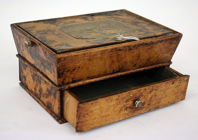 A SMALL REGENCY SATINWOOD WORK OR JEWELLERY BOX of waisted rectangular form with lifting lid to the top and small drawer to the front, the lid decorated with small engraving of Greenwich Hospital, 20cm wide