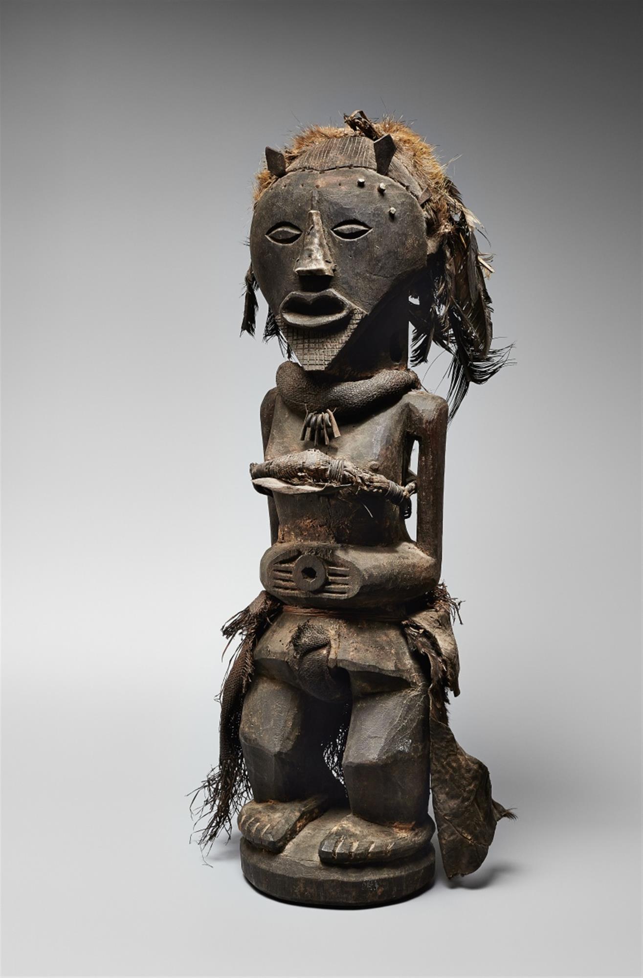 Standing with the hands on the abdomen flanking a small fetish cavity, the face with rudimentary features and cross-hatched beard, white metal panel covering the nose, the forehead with inset metal blades and pins, various charges about the body, fea