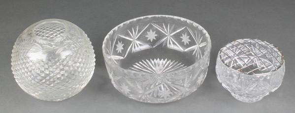 A spherical glass vase 6", a ditto rose bowl and a fruit bowl