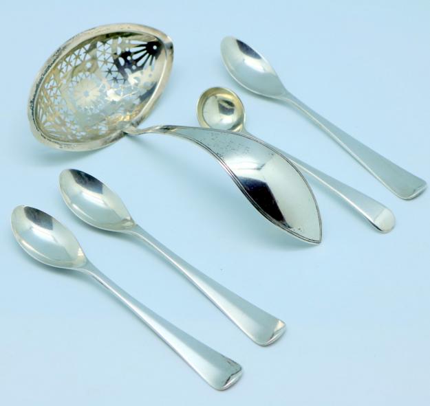 A sptisovale bin pointed to handle with profiled edge. the tank exploded with rays, stars and floral decor. C. Preijers, Amsterdam. Jl. 1828. The teaspoons Hague lofje. Mt. H. Hooijkaas, Schoonhoven. Jl. 1942. Z. 835. Here mustard spoon. England, Lon