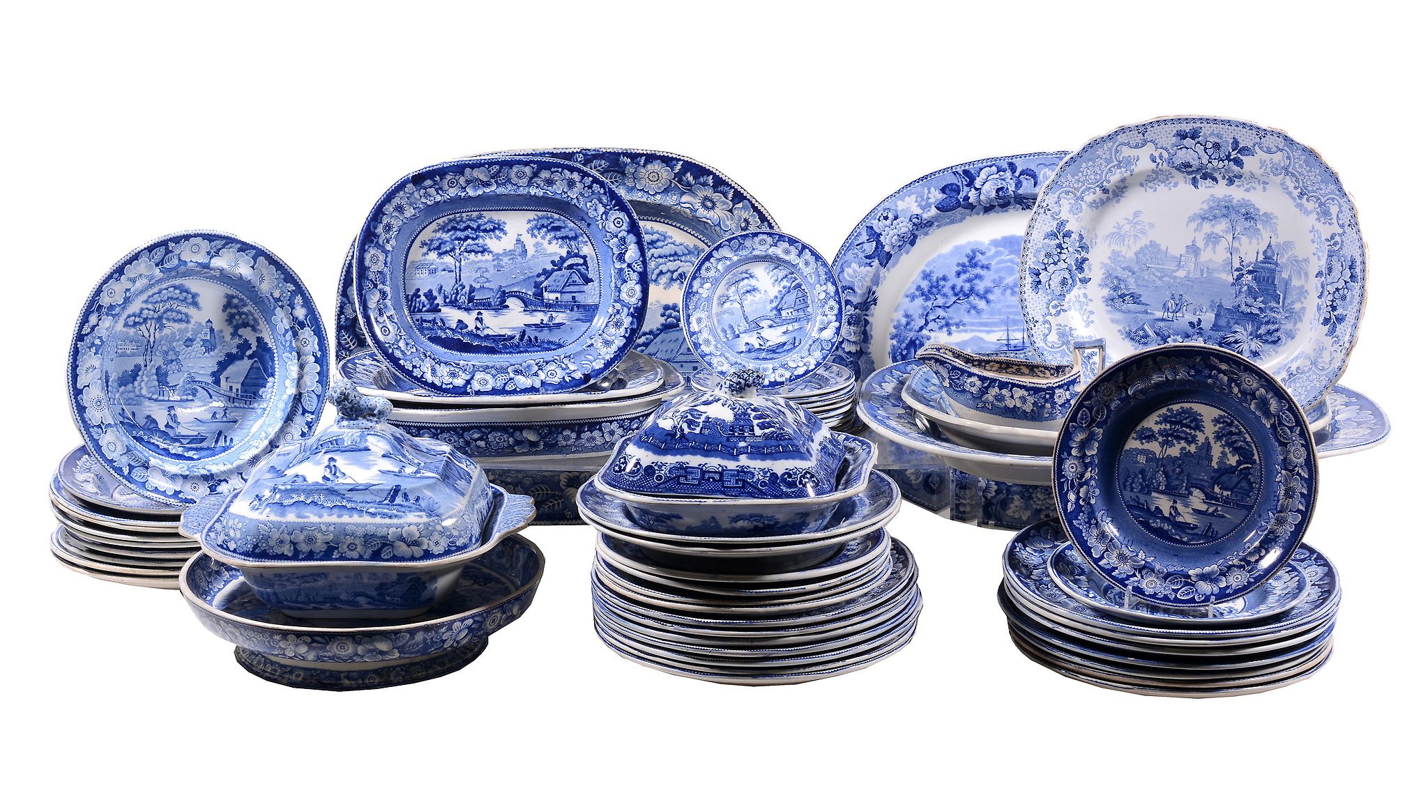 comprising; a vegetable tureen and cover, another with an associated cover, a cheese stand, a sauce boat, six various meat dishes in sizes, fourteen various dinner plates, eight various soup plates, eight various breakfast plates, four various side p