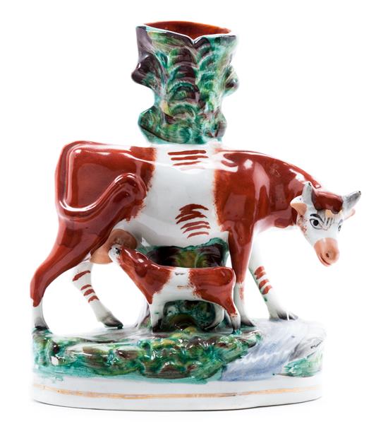 A Staffordshire Pottery Vase modeled with a cow and a calf