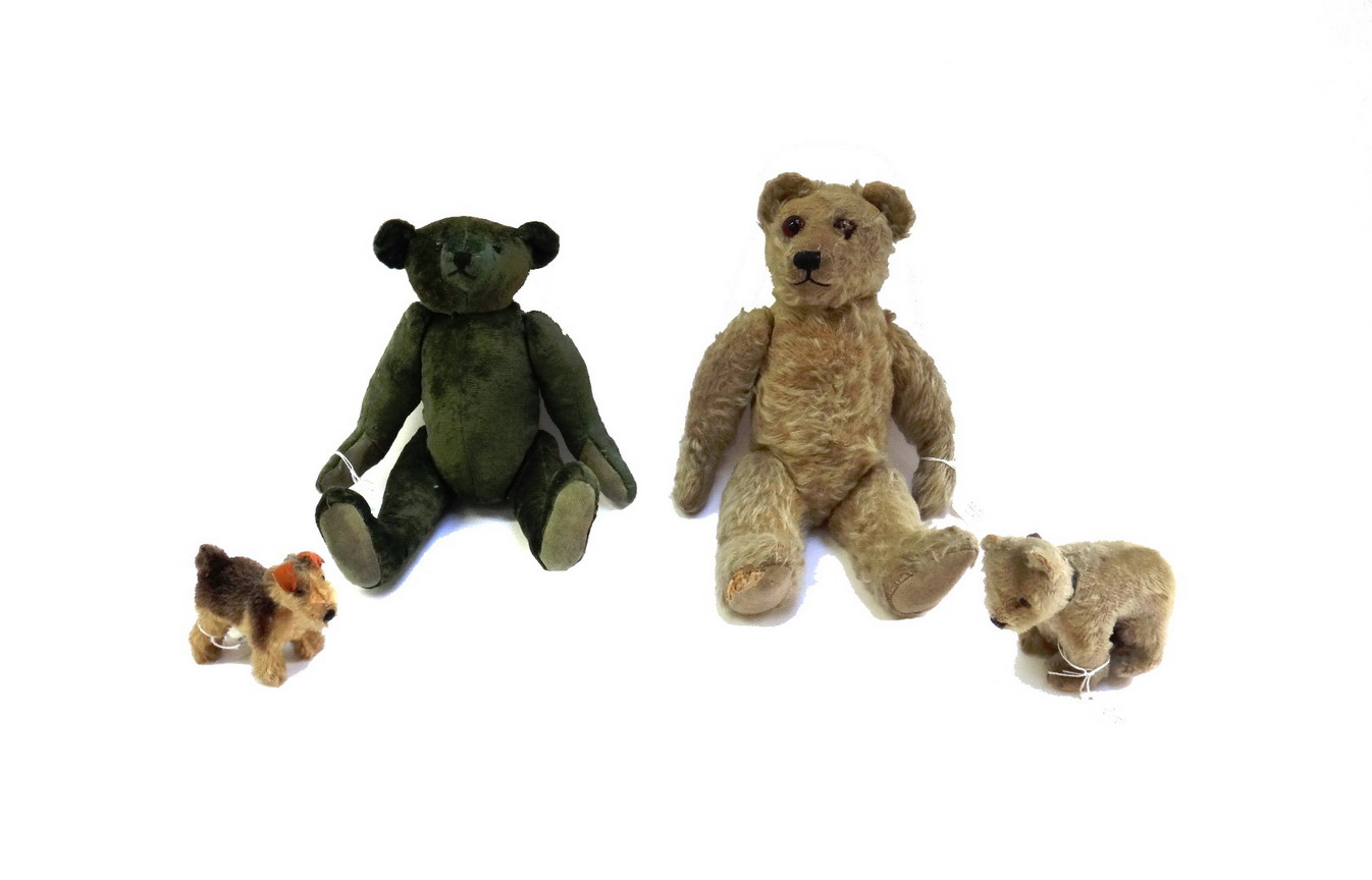 33cm, together with another vintage teddy bear with gold plush fur, a small stuffed bear cub and a dog. (4)