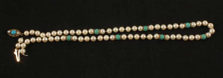 A string of Pearls and Turquoise beads with 9ct Gold clasp (as found)