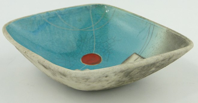 A Studio Pottery bowl of bulbous rectangular form, with setting sun design, unsigned, width 7.25''.
