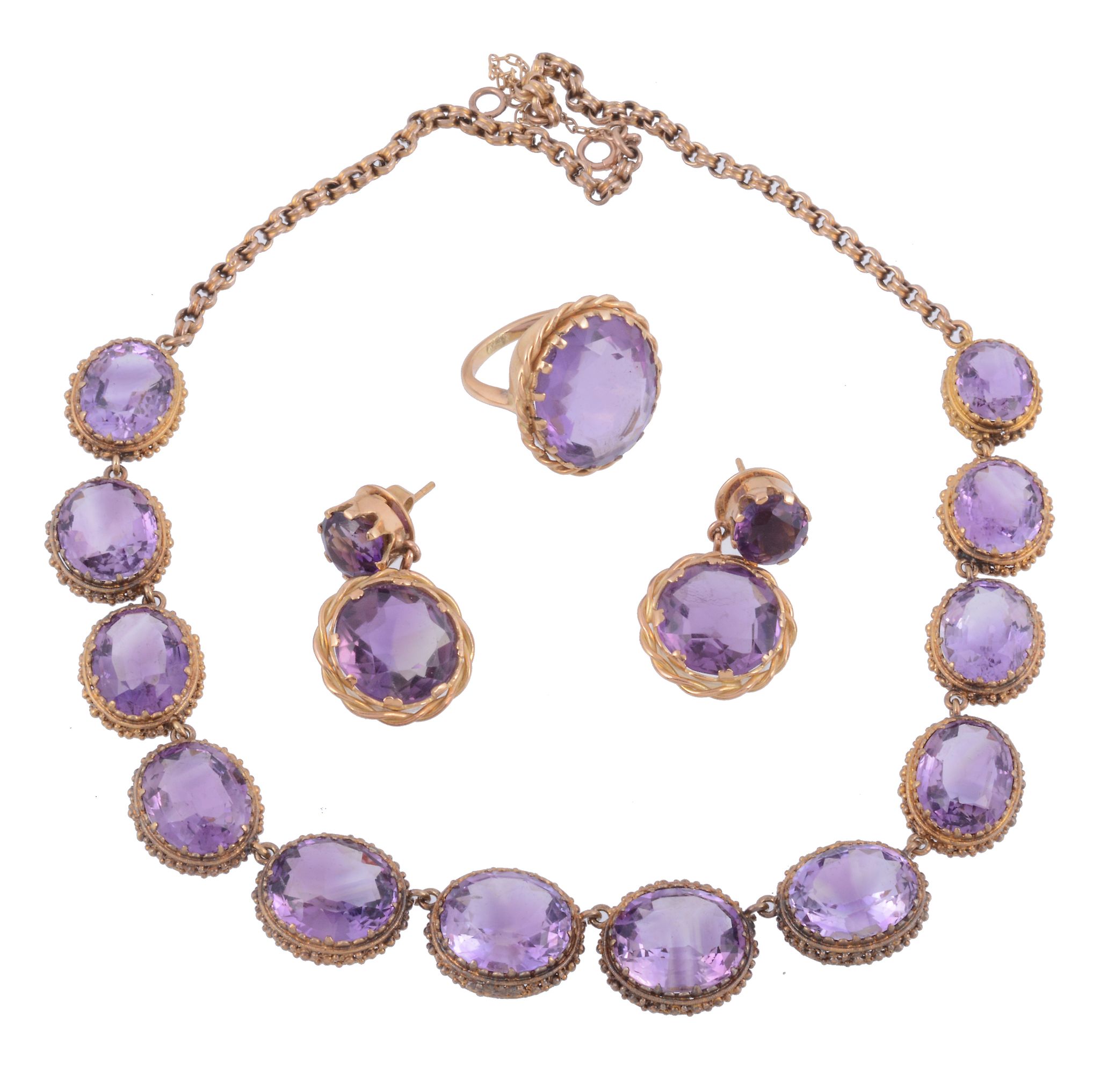 the necklace with graduated oval cut amethyst within beaded borders, to a belcher link back chain, 40cm long, together with a pair of circular cut amethyst ear pendents, with a claw set surmount above a ropetwist set amethyst drop, 3.2cm long, and an