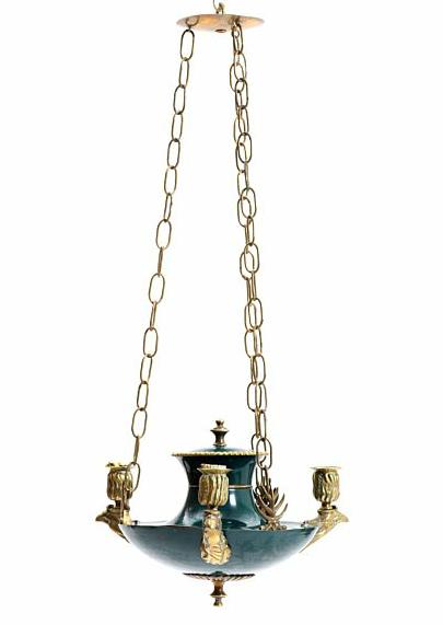 A Swedish 19th century Empire style three-light bronze and green painted metal chandelier, decorated with eagle heads
