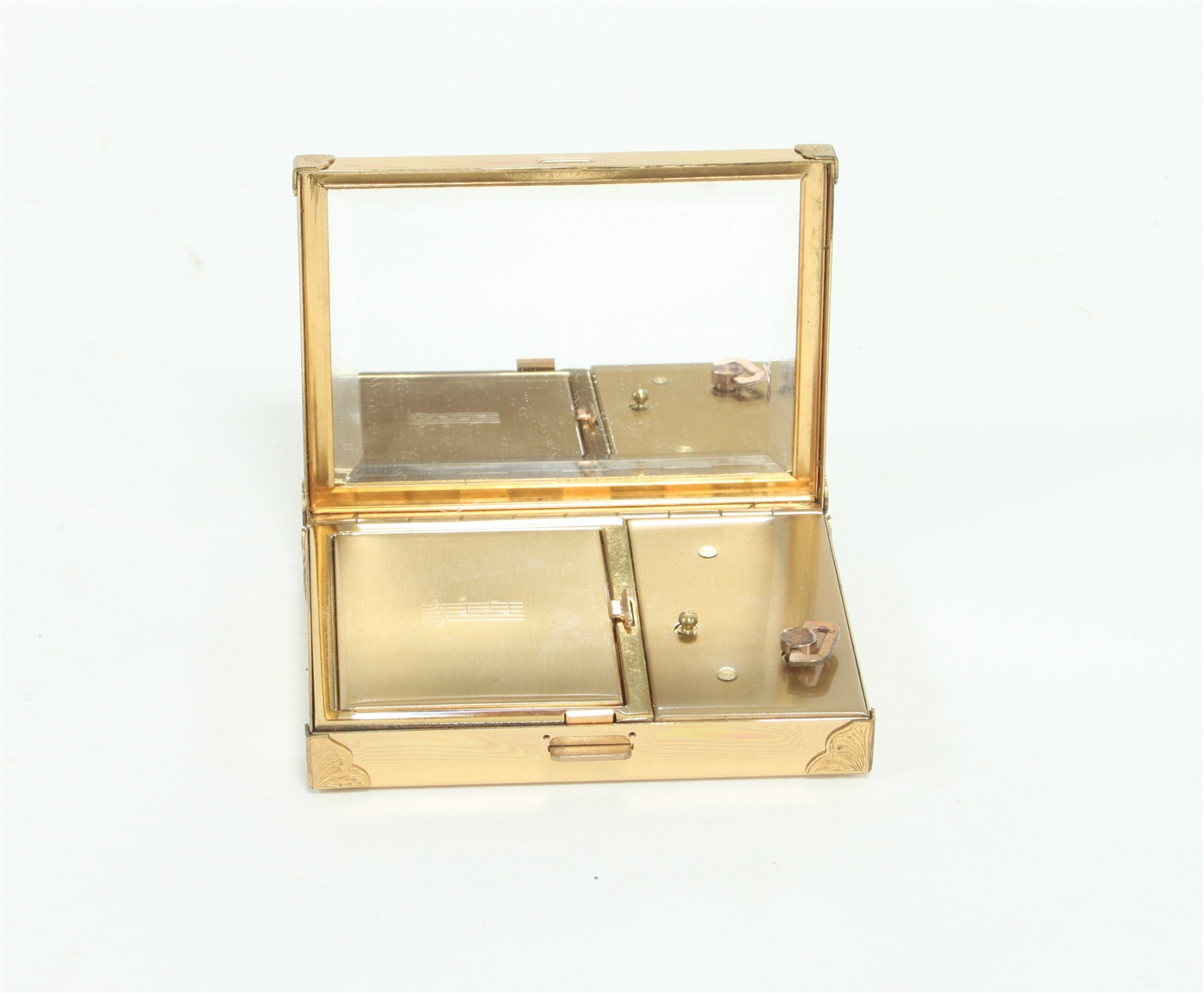 A Swiss musical compact, the hinged cover enclosing a mirror