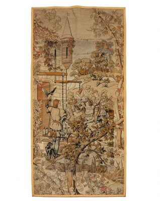 A tapestry in classical Gobelin style, decorated with falconers at a castle
